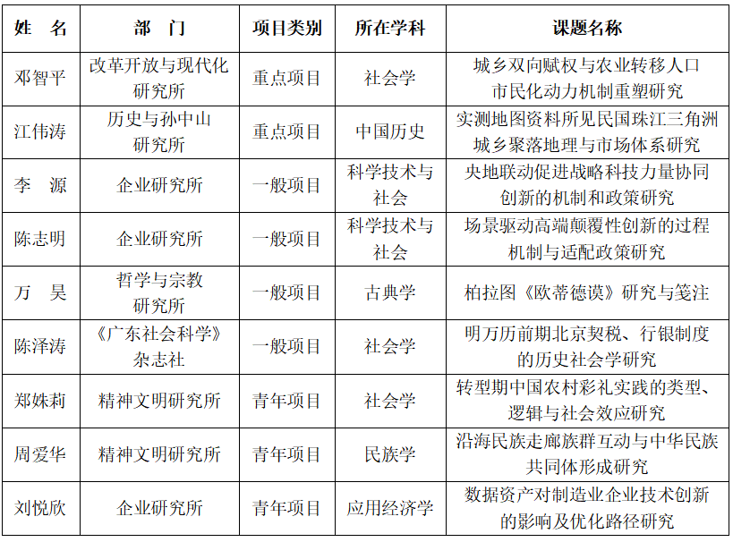 广东省社会科学院2025年国家社科基金年度项目立项名单