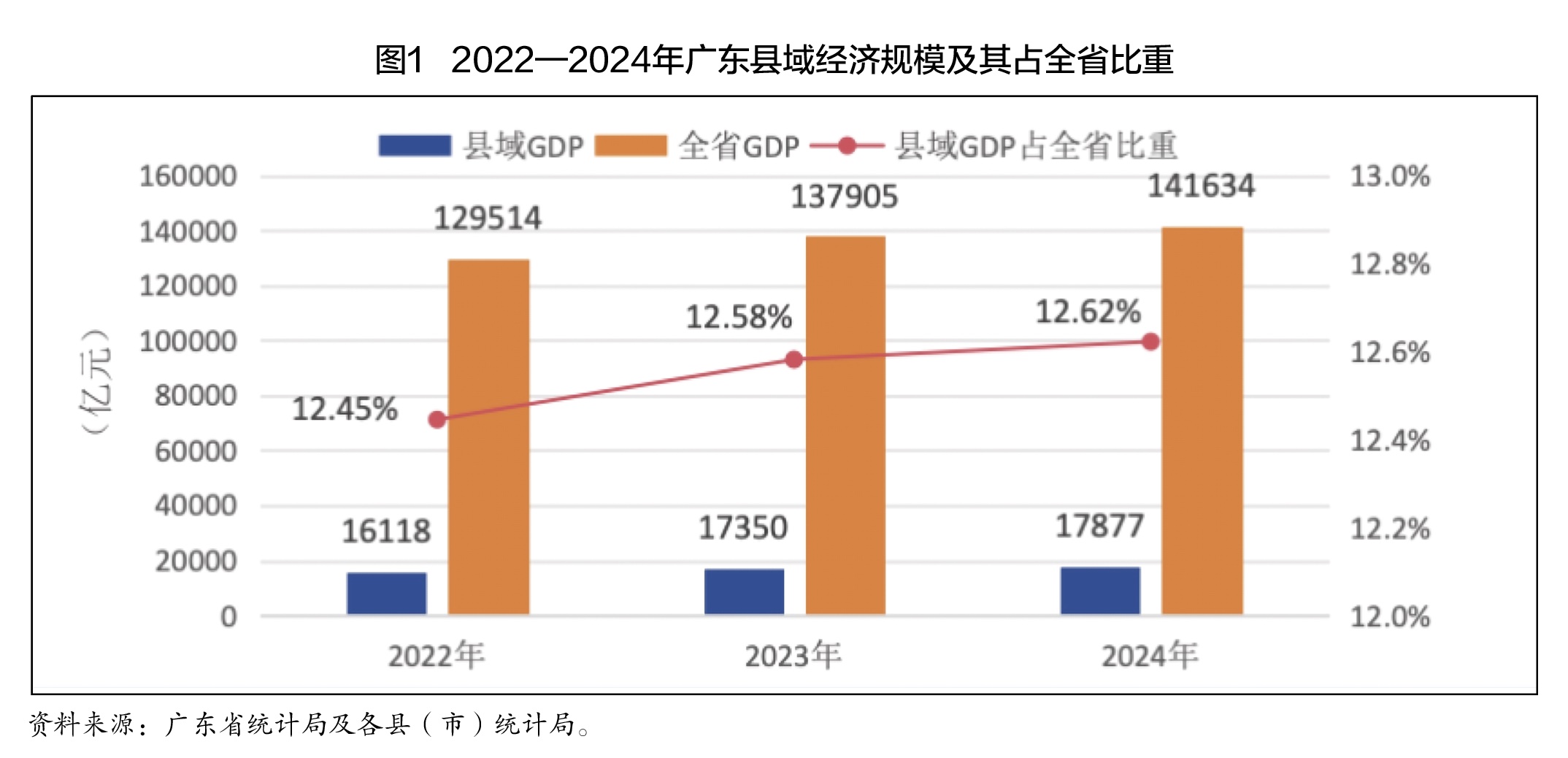2023年以来,随着“百千万工程”的深入实施,广东县域发展活力充分迸发,经济增长加力提速,增速超过全省平均水平,县域经济占全省比重持续上升。2024年,57个县(市)实现地区生产总值17877亿元,比上年增加527亿元,名义增长3.0%,比全省同期名义增速高0.3个百分点,实际增长3.7%,比全省同期高0.2个百分点;县域经济占全省比重由2022年的12.45%提高至12.62%,提高0.17个百分点(见图1)。