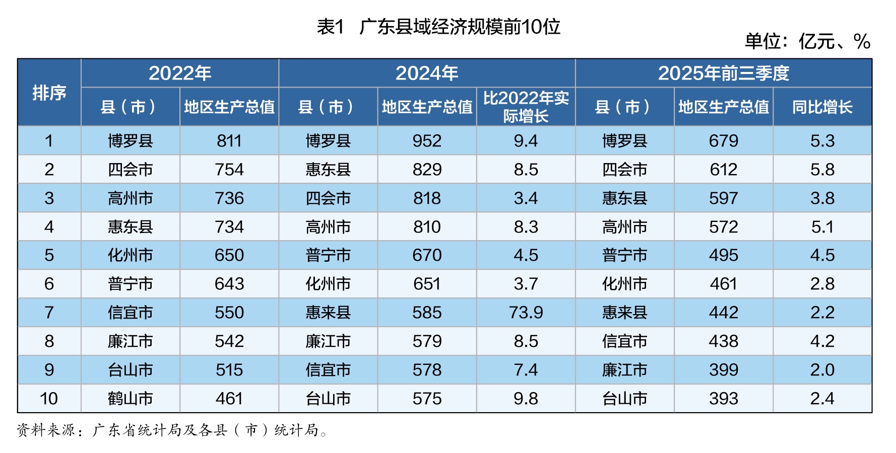 县域经济格局发生显著变化。2023年以来,各县(市)在高质量发展赛道上争先进位,经济总量不断扩张。2024年,全省经济总量最大的博罗县地区生产总值952亿元,名义增长17.4%,“千亿县”目标已然在望。县域经济前10入围门槛也由2022年的461亿元提高到2024年的575亿元。排位前10县(市)中,惠来县因广东石化炼化一体化项目投产拉动经济实现跨越式发展,经济规模由2022年的第23位上升到2025年前三季度的第7位,排位提升了16位,尤其令人瞩目;此外,惠东县、普宁市排位均上升1位,鹤山市被挤出前10之列(见表1)。2025年,广东有3个县(市)进入“赛迪百强县”榜单,创造了广东在榜单上的历史最好成绩。其中,博罗县跃升至第65位,四会市挺进第85位,惠东县首度跻身第100名。