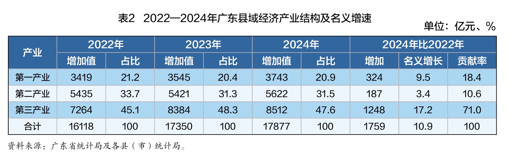 县域要振兴,产业振兴是关键。自“百千万工程”实施以来,广东各县(市)立足资源禀赋和产业基础,持续推动产业园区提质增效,促进园区产业特色化集群化发展,加力提速培育县域特色优势主导产业,工业经济成为县域经济增长主引擎。截至2024年底,广东57个县(市)共有规上工业企业8515家,比2022年增加725家,增长9.3%,增幅明显高于全省同期4.5%的水平。2023—2024年,57个县(市)中有30个县(市)规上工业增加值累计实际增长幅度超过全省8.8%的水平,占比52.6%。2023—2024年,57个县(市)第一产业累计实际增长幅度超过全省同期8.5%水平的县(市)有36个,占比63.2%;第二产业累计实际增长幅度超过全省同期7.7%水平的县(市)有35个,占比61.4%;第三产业累计实际增长幅度超过全省同期9.1%水平的县(市)只有12个,占比21.1%。显然,第一、第二产业是过去两年广东县域经济增速赶超全省的动力来源。其中惠来县最为典型。2023—2024年,惠来县地区生产总值累计实际增长73.9%,其中,第一产业累计实际增长11.3%,比全省同期水平高2.8个百分点;第二产业在石化项目投产拉动下,累计实际增长240.2%,远超全省同期水平;第三产业实际增长4.2%,比全省同期水平低4.9个百分点。