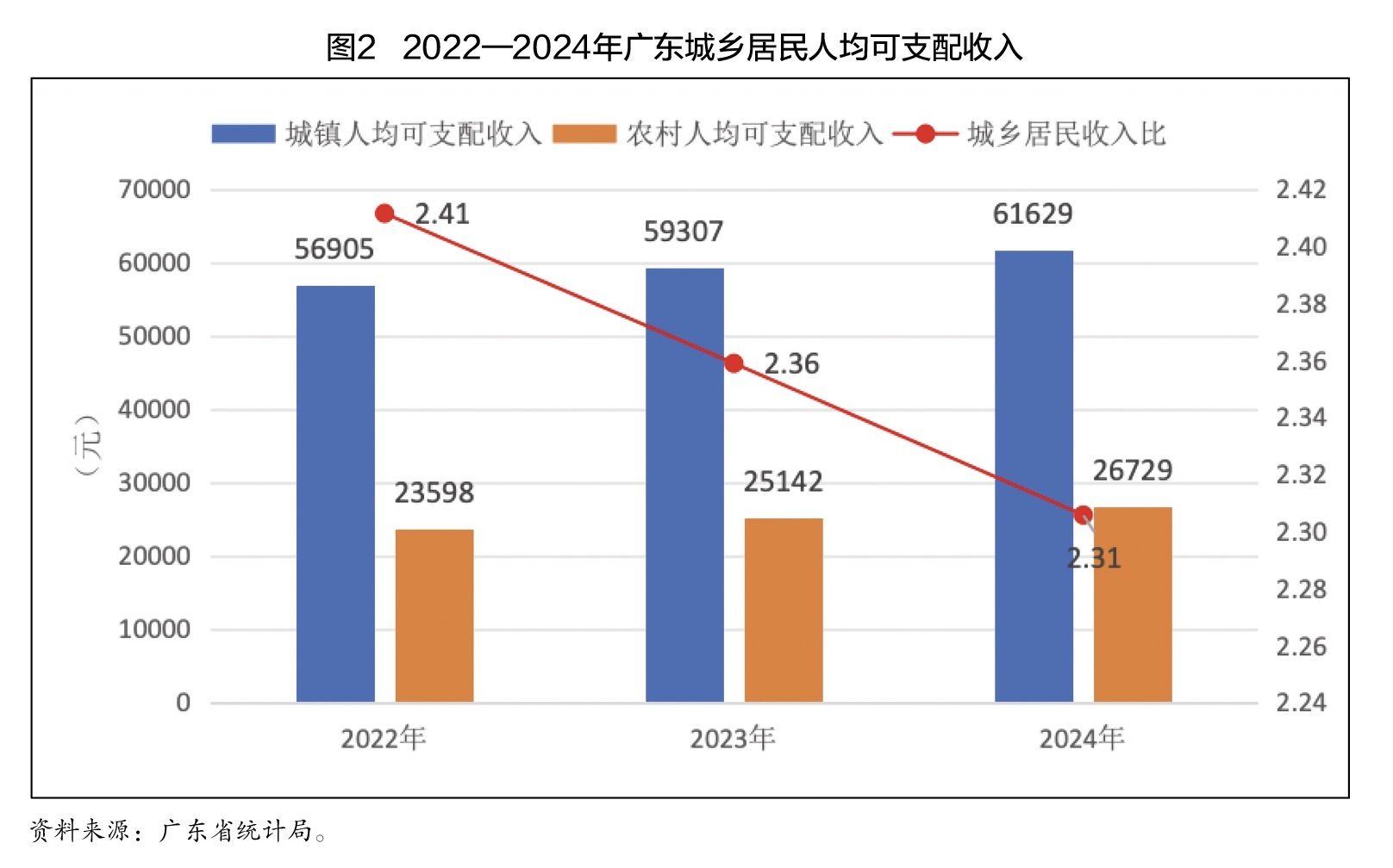 县域经济的蓬勃发展为居民增收提供了坚实基础。县域承接产业有序转移,培育壮大本地特色产业,当地居民实现了“家门口就业”,工资性收入稳步提高。此外,随着现代农业、乡村旅游、农村电商等富民兴村产业的加快发展,“公司+合作社+基地+农户”“保底收购+按股分红”等多种合作帮扶模式的推广普及,以及新型农村集体经济持续壮大,让农民深度参与产业发展、共享发展红利,有效拓宽了农民的增收渠道。全省农村居民人均可支配收入增速连年高于城镇居民,2023、2024年分别增长6.5%、6.3%,比同期城镇居民人均可支配收入增速分别高2.3个、2.4个百分点。全省城乡居民收入比也由2022年的2.41∶1缩小至2024年的2.31∶1(见图2)。2025年前三季度,全省农村居民人均可支配收入增长6.2%,继续大幅领先城镇居民的4.1%,显示出强劲的追赶势头。2023—2024年,全省57个县(市)中有44个居民人均可支配收入两年累计增长超过全省同期9.4%的水平,占比达77.2%。其中,东源县以15.9%的增幅居首位,五华县、龙川县以14.7%的增幅并列第二位,鹤山市以14.2%的增幅居第三位。