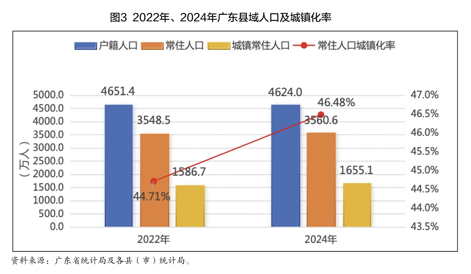 城乡人口流动出现积极变化。长期以来,广东县域整体常住人口一直低于户籍人口,呈现人口净流出状态。只有工业化城镇化水平较高的博罗县、四会市、鹤山市等少数县(市),有能力吸引不同规模的外来人口,常住人口长期超过户籍人口,为人口净流入县(市)。但近年来,随着县域经济的提速发展、工业化的快速推进,以及以县城为重要载体的新型城镇化推进,县城的承载力和吸引力增强,大部分人口净流出县(市)在户籍人口继续外迁的同时,本地外出人口也出现明显净回流趋势,聚人聚商聚产效应凸显。2024年,57个县(市)常住人口3560.6万人,比2022年增加12.1万人;城镇常住人口1655.1万人,比2022年增加68.4万人;常住人口城镇化率达46.48%,比2022年提高1.77个百分点,比全省同期高0.65个百分点(见图3)。与2022年相比,2024年57个县(市)有30个常住人口增加,占比52.6%。其中,四会市、普宁市、廉江市分别增加3.28万、2.33万、1.34万人,常住人口增量位居全省前三位;55个县(市)城镇常住人口增加,其中,高州市、五华县、化州市分别增加4.99万、3.64万、3.61万人,常住人口增量位居全省前三位;东源县、蕉岭县、新兴县城镇化率分别提升了3.9个、3.8个、3.6个百分点,提升幅度居全省前三位。