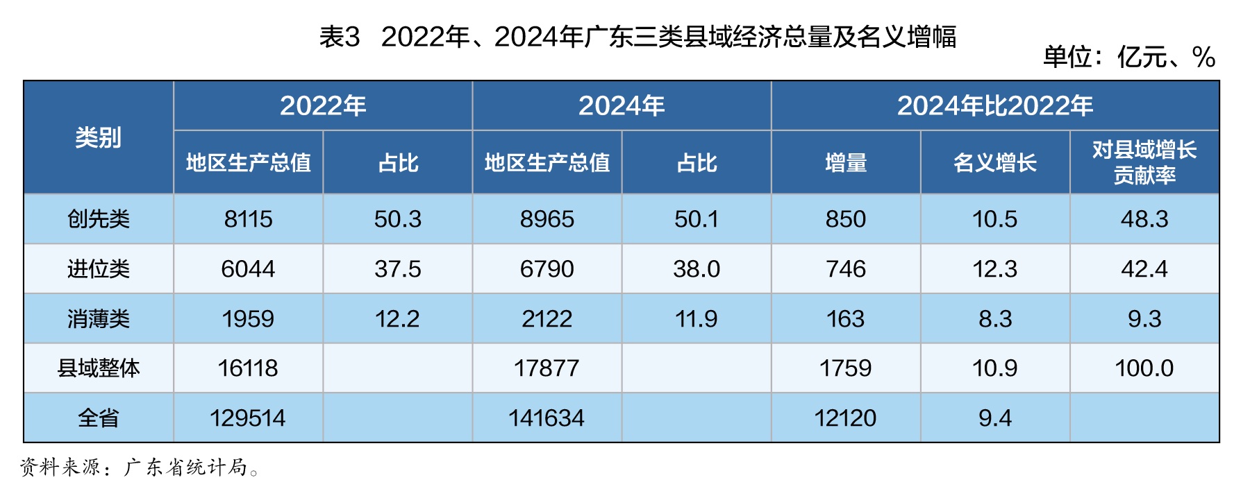 近三年创先类县域增长总体稳健,在全省县域经济中地位举足轻重。2024年,创先类县域实现地区生产总值8965亿元,占全省县域经济总量的50.1%,比2022年增加850亿元,贡献了全省县域经济增量的48.3%,居三类县域之首,名义增长10.5%,高于全省同期名义增幅1.1个百分点,但低于全省县域同期名义增幅0.4个百分点,由此导致其占全省县域经济总量比重比2022年下降0.2个百分点(见表3)。从实际增速看,2023—2024年,15个创先类县(市)有7个年均实际增速高于全省同期年均实际增速4.1%的水平,占比46.7%。其中,英德市、鹤山市以5.5%的年均实际增速并列创先类县(市)首位,台山市、博罗县分别以4.8%、4.6%的增速居第2、第3位。2025年前三季度,15个创先类县(市)有6个增速高于全省同期,占比40.0%,总体增长形势稳中趋弱。其中,四会市、海丰县、博罗县分别以5.8%、5.5%、5.3%的增速位居前三位。