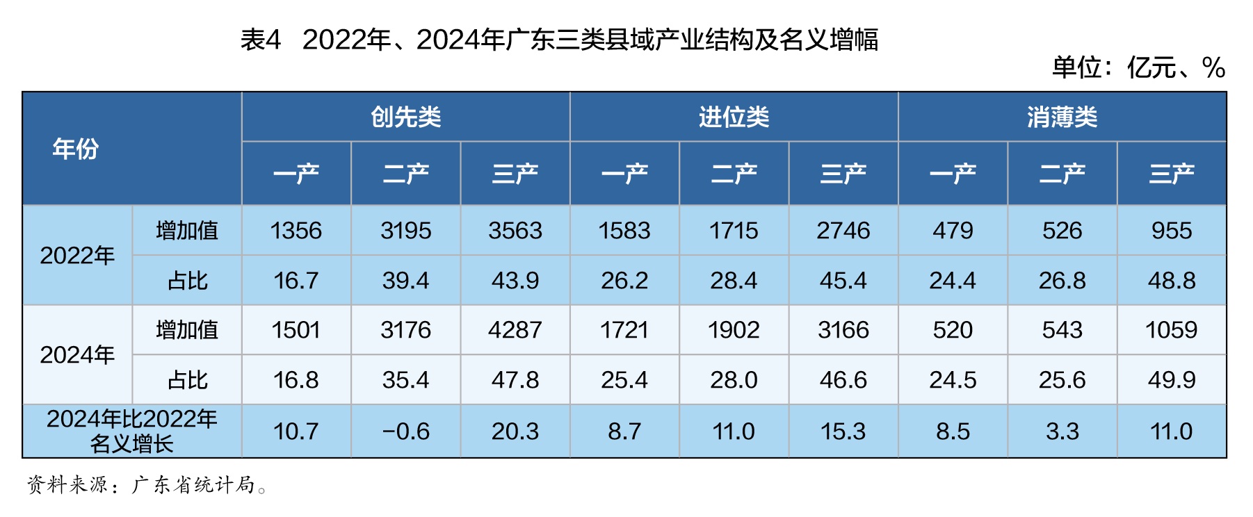 创先类县域产业结构层次最高,其工业化走在全省县域的前列、发展较为充分,现代服务业有一定基础,产业结构相对高级化。2024年,创先类县域整体三次产业结构为16.8∶35.4∶47.8(见表4)。经济较为发达的博罗县、四会市、鹤山市等珠三角县(市),第一产业占比已经下降到10%左右,第二产业占比已经达到50%以上,并形成较为成熟的主导产业集群。进位类县域整体产业结构水平明显落后,正处于转型关键期。第一产业比重仍然较高,工业化尚处在加速阶段,第二产业比重仍较低,第三产业以传统服务业为主;2024年三次产业结构为25.4∶28.0∶46.6。消薄类县域发展阶段、产业结构水平与进位类相近,主要区别在于其工业化动能相对不足,导致其二产疲弱、三产偏高。