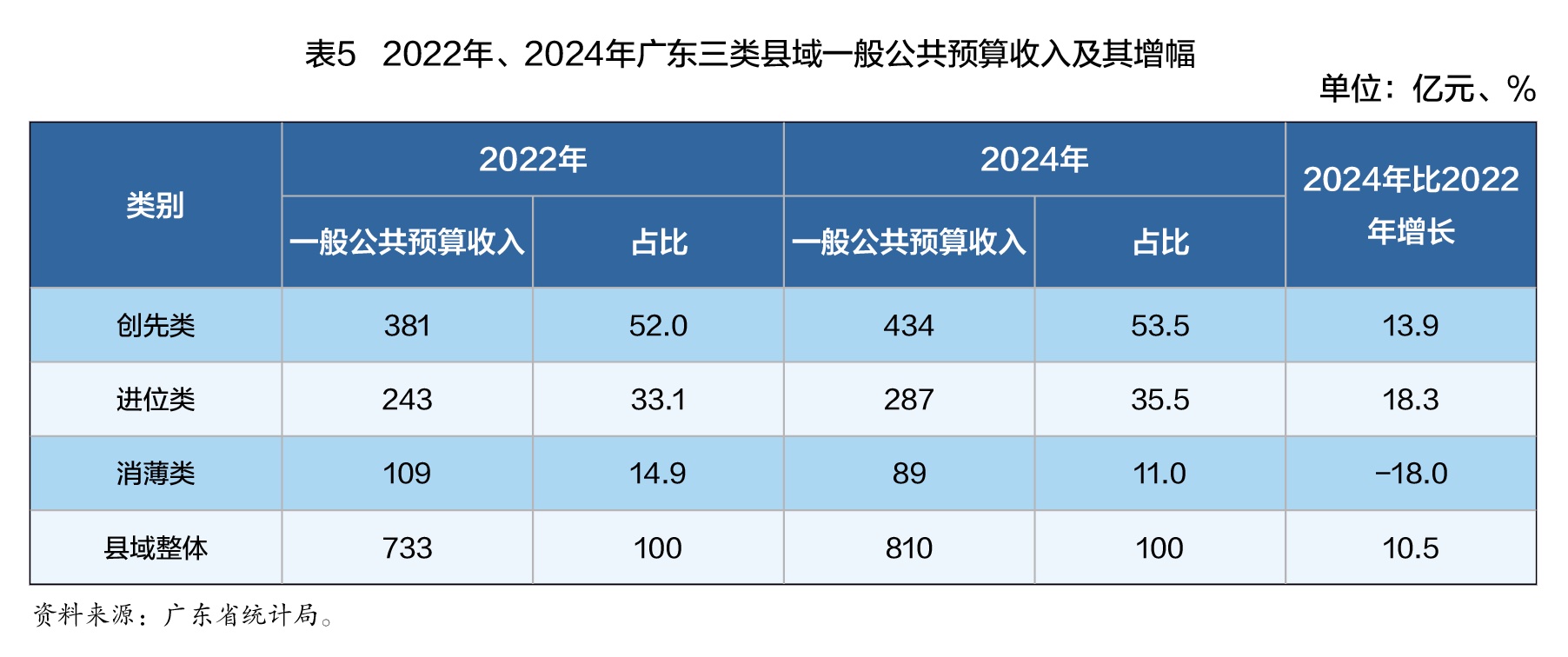 进位类县(市)整体发展水平次于创先类,财政实力也相对较弱,但在经济提速发展情况下财政收入也实现了快速增长。2024年,进位类县域实现一般公共预算收入287亿元,比2022年增长18.3%,增幅比全省县域高7.8个百分点;占全省县域一般公共预算收入的35.5%,比2022年提升2.4个百分点。单个县(市)收入规模两极分化明显。2024年,进位类县域一般公共预算收入在1.5亿~20.0亿元区间,均值为10.6亿元,中位数为10.3亿元。2023—2024年一般公共预算收入增长最快的3个县(市)全部出自进位类。其中,惠来县是经济高速增长带来财政收入高速增长的典型,大项目驱动效应显著。