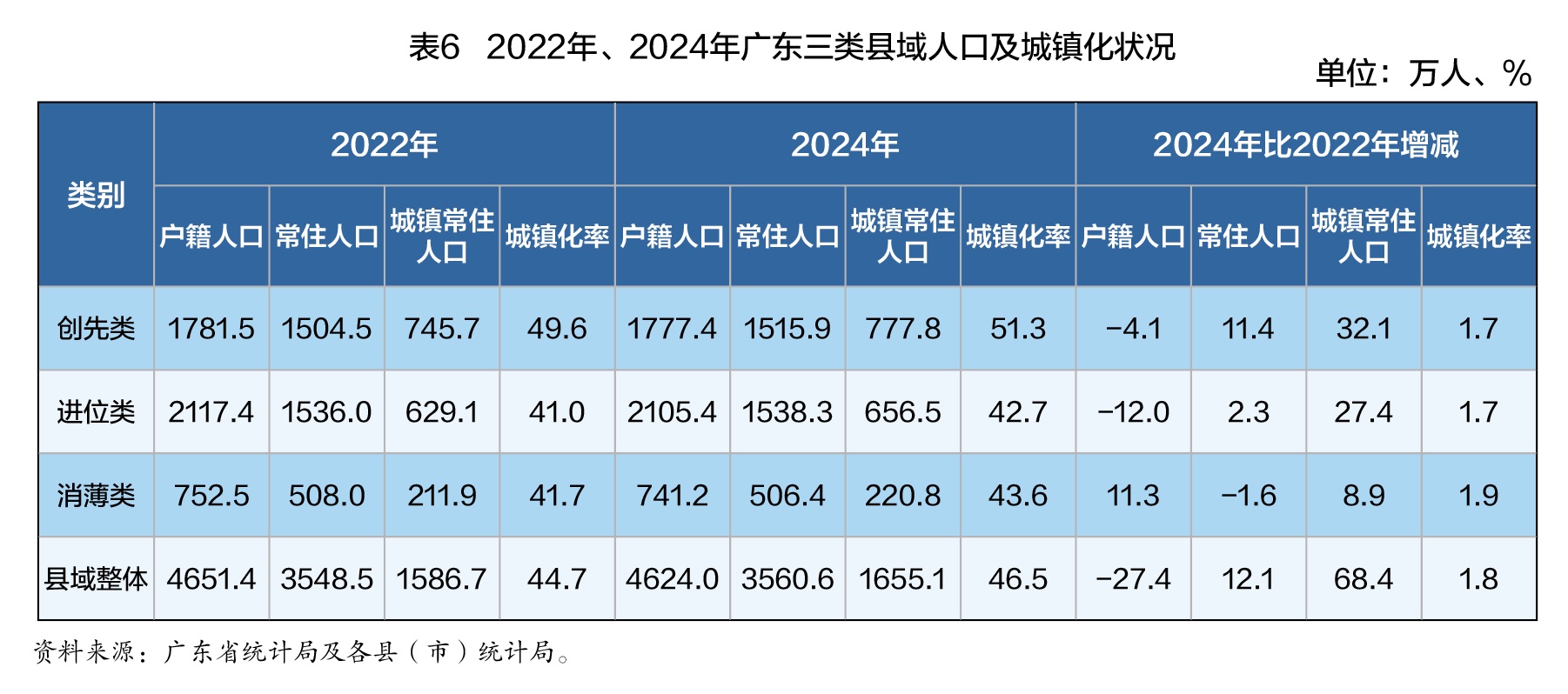 三类县域在人口与城镇化发展上呈现明显的梯度差异。创先类县域城镇化水平最高,也是县域人口集聚高地。2024年末,创先类县域常住人口1515.9万人,占县域整体常住人口的42.6%,常住人口城镇化率51.3%,大幅高于其他两类县域,其中最高的四会市城镇化率已超过70%。与2022年相比,创先类县域2024年户籍人口下降4.1万人,但常住人口增长11.4万人,城镇常住人口激增32.1万人,城镇化率提高1.7个百分点,成为全省县域城镇化的标杆(见表6)。反映出创先类县域已具备较好的产业基础、就业机会和城镇基础设施,吸引了较大规模的外来人口流入和本地外出人口回流。