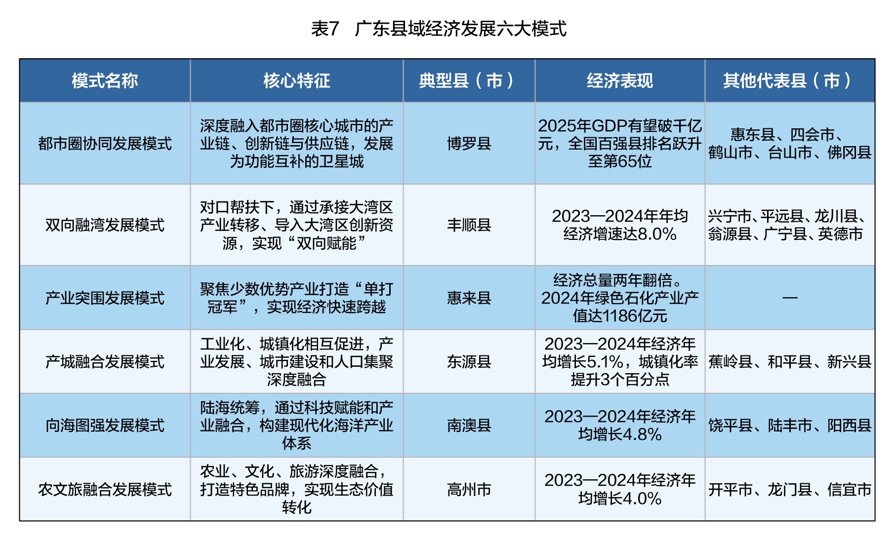 向海图强发展模式是广东沿海县(市)依托丰富的海洋资源,将海洋这一“蓝色宝库”转化为经济发展新动能的战略性路径。其核心在于坚持陆海统筹,通过科技赋能、产业融合与生态优先发展,构建现代化的海洋产业体系,拓展蓝色经济发展空间。该模式不仅致力于升级改造传统的海洋渔业与滨海旅游业,更大力发展现代化海洋牧场、海洋新能源、临港工业等新兴蓝色产业,实现从浅海到深海、从单一开发到立体利用的转变,推动海洋经济和县域经济高质量发展。汕头南澳县是广东县域经济向海图强发展模式的典型代表。作为广东省唯一的海岛县,南澳县以生态保护为前提,坚持“工业不上岛”和“生态立岛”理念,以科技创新和产业融合为驱动,大力推动传统渔业向现代化海洋牧场转型升级,打造“蓝色粮仓”,开创“海上风电+海洋牧场”集约发展新模式,充分挖掘其作为国家4A级旅游区的海岛资源优势,致力打造国际海岛休闲旅游目的地,成功探索出一条依托海洋资源,通过科技赋能与产业融合,实现蓝色经济高质量发展的特色路径。2023—2024年,南澳县经济年均增长4.8%。2024年南澳县文旅产业、海洋渔业、新能源三大特色产业产值分别为40.0亿元、21.1亿元、6.5亿元。2025年前三季度,南澳县经济增长4.0%。除南澳外,该模式的代表还有潮州市饶平县、汕尾陆丰市、阳江市阳西县等县(市)。